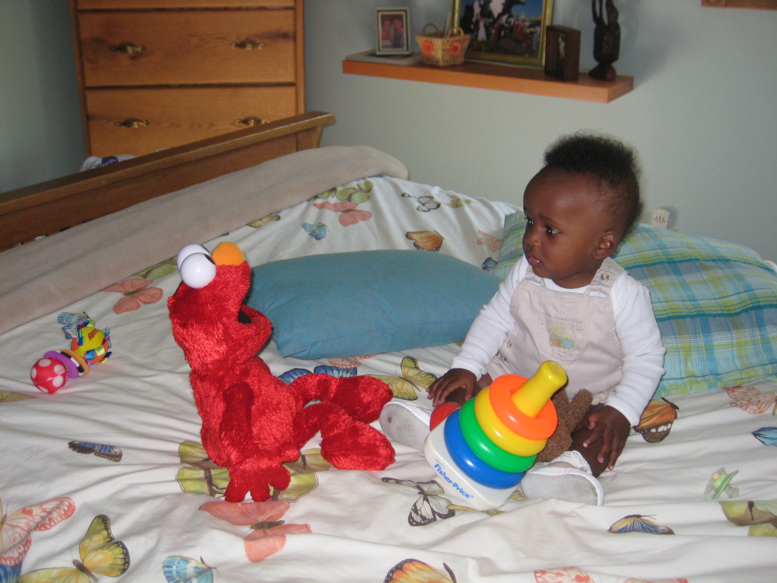 Here you can see him having a deep conversation with an old Elmo doll. He seems a little skeptical I think…